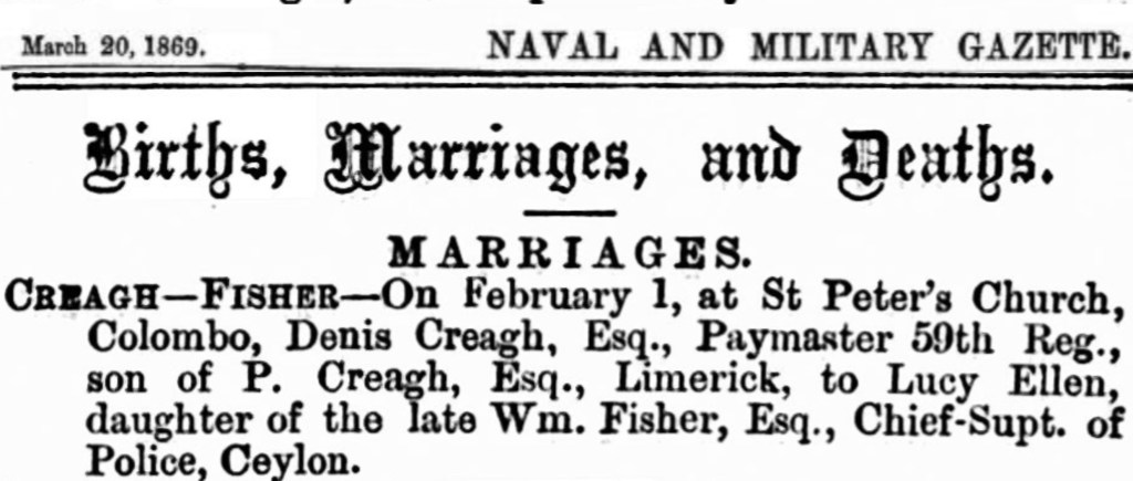 Yesterday evening I was yet again struggling to complete my Fisher Tree this time looking for one of William’s children the elusive Lucy Ellen and again asked on the ancestry group facebook group. They have have some mighty fine and fast searchers on there. I went to do my weekly shop and before I was even home I noticed that someone had found her marriage. Again a marriage in Ceylon so not easy to find in the ordinary records.