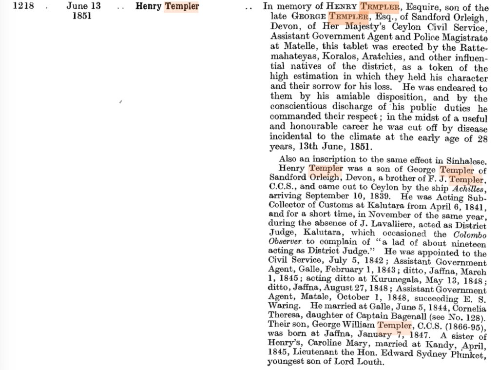 Caroline Templer Henry’s sister did eventually come out to Sri Lanka and did marry an officer out there. It seems likely that she finally gave in to Henry’s request and went to “keep house” for him. Although his may have been after he married Cornelia in 1844 (or perhaps after their father died in 1843). Caroline married Edward Plunkett in Sri Lanka in 1845.