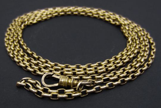 “Long guard chains were first worn by women in the early 1800s. They were long and light and were draped over the shoulders and caught at the waist with a watch hook or tucked under a belt or in a watch pocket. They were used to carry watches as well as lorgnettes or vinaigrettes, and were described as ‘guard chains’. Women continued to wear long chains, about 152.4cms (60 inches) long, in the Victorian period but the chains had become thinner and they were worn around the neck. Depending on their use, such chains were also called ‘watch chains’ , ‘lorgnette chains’ or ‘muff chains’. Some had a swivel attachment and some had a slide to allow the drape of the chain to be adjusted.”