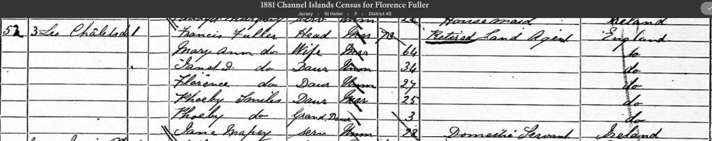 By 1881 she was with her parents in St Hellier, Jersey at the age of 28. This was possibly a holiday as there is no evidence that they lived there for any length of time. Florence’s parents then moved to Hove in 1882 and Florence probably moved with them to 63 St Aubyn’s Road.