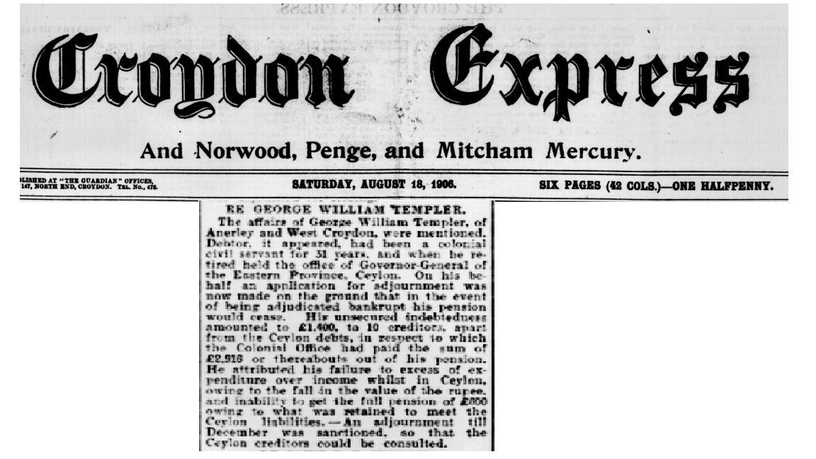 George had retired to England by 1906 and seems to be living in Croydon and Anierley, South London. He was declared bankrupt due to problems with the exchange rate between the rupee and the pound according to his testimony .