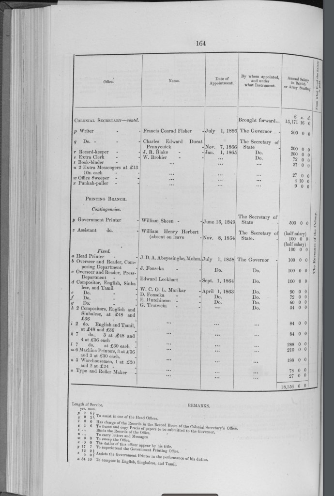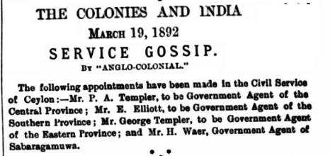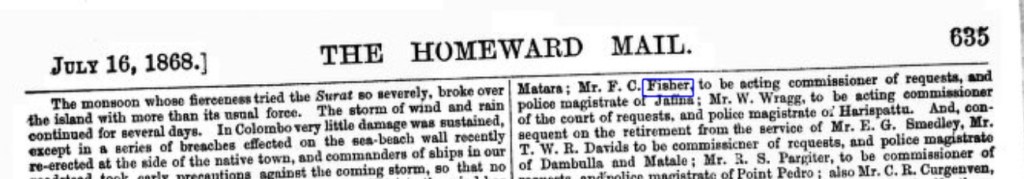 A move from magistrate for Kandy and Kornegalle to Jaffna in 1868. He was 18 at this point. What amuses me is that one of my great great grandfathers is replacing another (G W Templer) as magistrate for Jaffna.