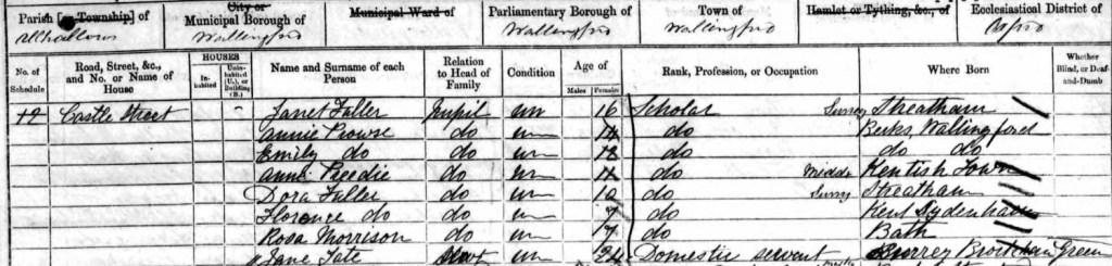 Florence was one of a large family of 14 siblings. In 1861 aged 7 she was at a small school boarding house of just 8 pupils at 12 Castle street in Wallingford, Oxfordshire. She was with her sisters Dora and Janet.