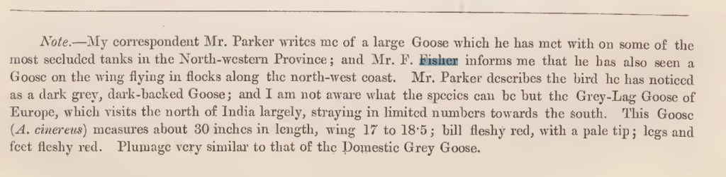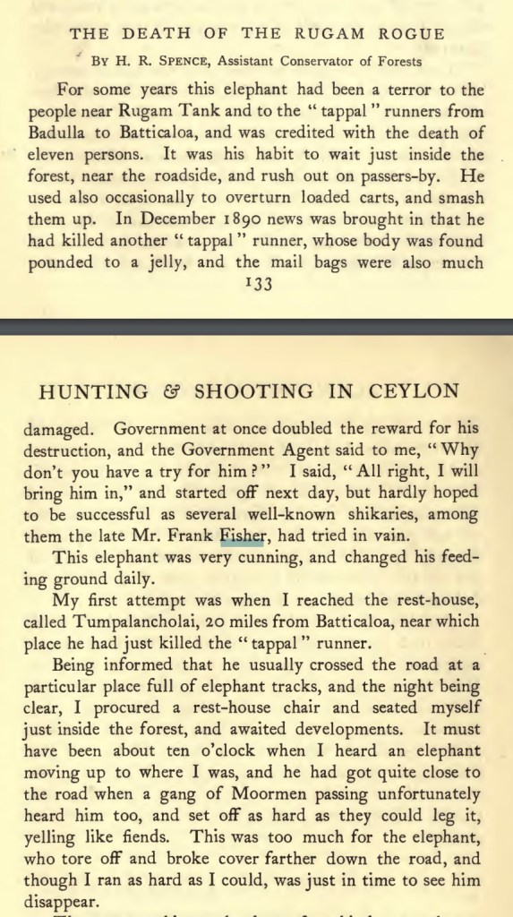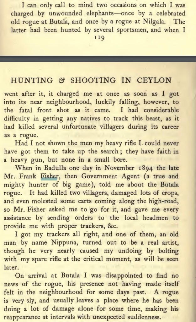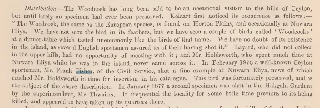 Frank is described as a “true and mighty hunter of big game” in Harry Storey’s “Hunting and Shooting in Ceylon” (1907). But the his underlying love of nature comes out in the quotes I found in “The History of the birds of Ceylon” where he was clearly in dialog with the author Captain W. Vincent Legge (see quotes below)