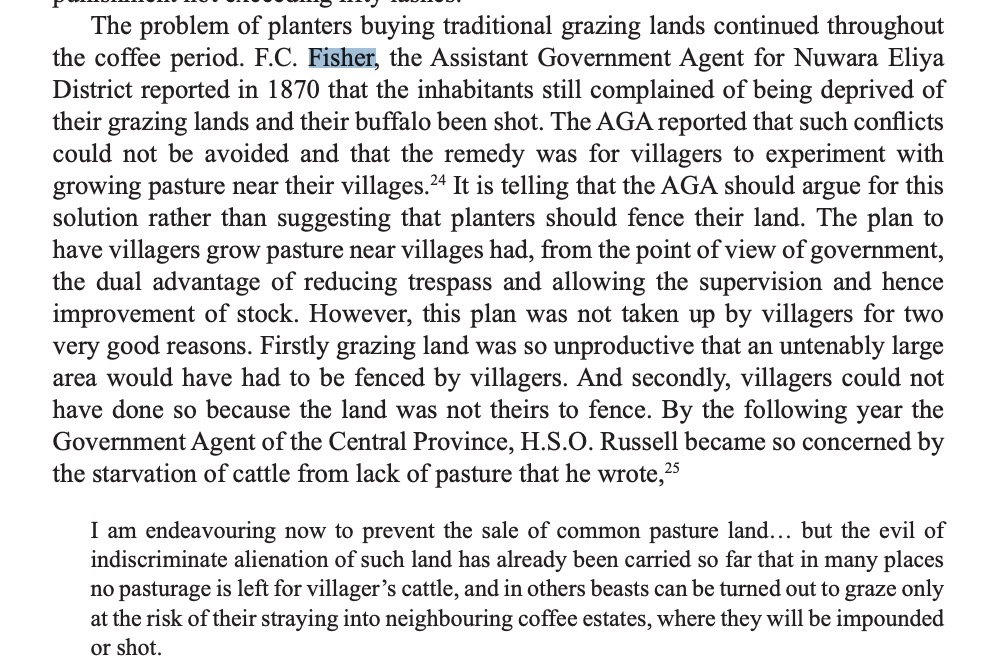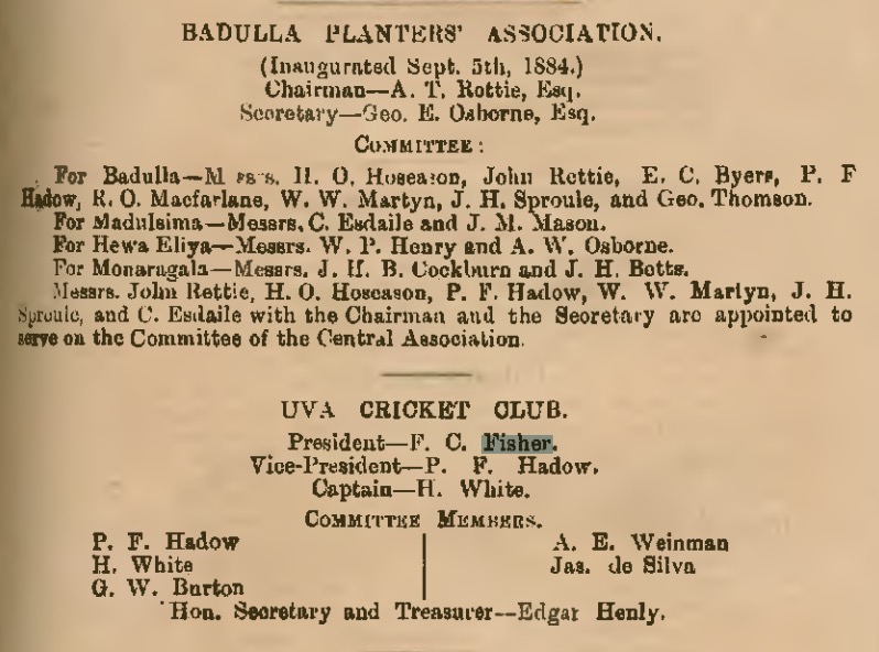 His father William Fisher was an army captain who was one of the first British to explore the central region of Sri Lanka and identify that it had good potential for plantations. He bought himself out of his army commitments and started a Coffee Plantation which he named Wavendon after his home village in England. Unfortunately many of the coffee plantations failed due to a financial crisis and William sold up and became the head of police. After the family had sold the estate it became the first tea estate in Sri Lanka and still produces tea to this day.