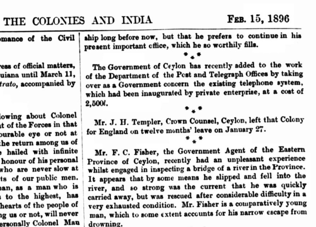 In 1892 Frank took some leave because he was unwell and in 1896 he had a scary incident where he fell into the river and was washed downstream. In 1897 he was again ill and took 3 months off work. However he continued to take an active interest in sport and was President of the Uva Cricket club in 1890.