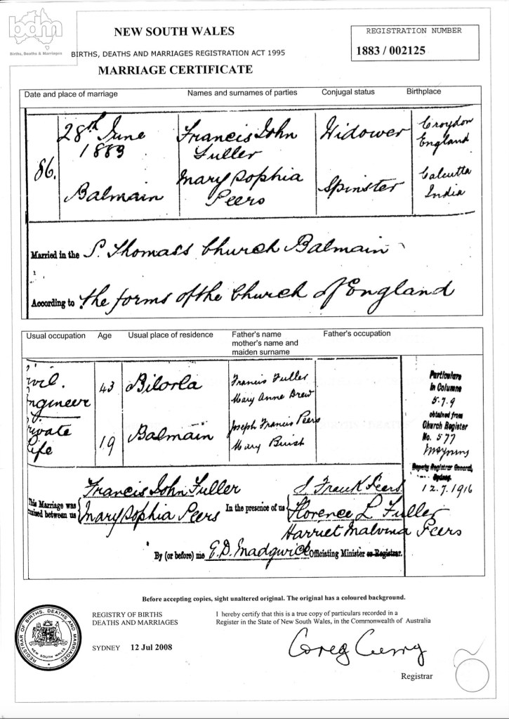 In June of 1883 Florence was in Australia because she was a witness to her brother Francis John’s second marriage. She must have returned home fairly quickly because she was married herself in England the following year.