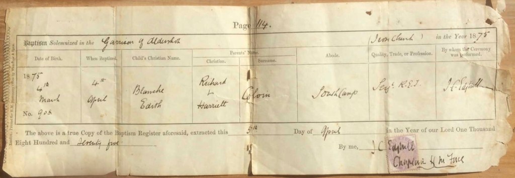 Blanche Edith Colvin was born in Aldershot at South Camp army barracks. Her father Richard Colvin had joined up at a young age from the slums of Central London. Her mother Harriet Lock was from a large family who had been based in Sunbury on Thames for generations.