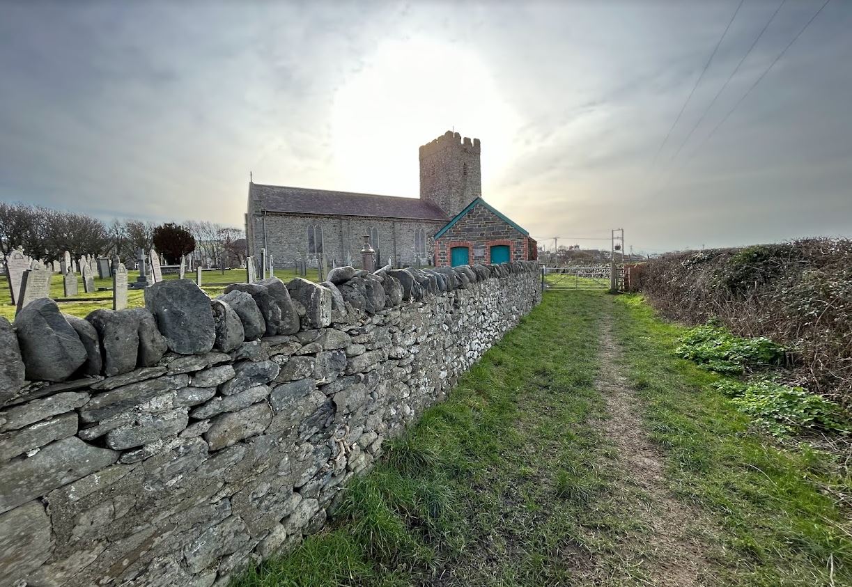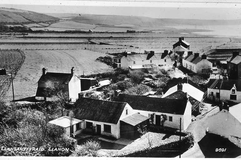 On the coastal plain between the church and the sea are the ‘Morfa Escob’, the Bishops Meadows. Bounded to the north and south by the Peris and Cledan streams, a rare survival of an ancient field system of strips known as ‘slangs’, by legend believed to be a gift from St David in 1231.”