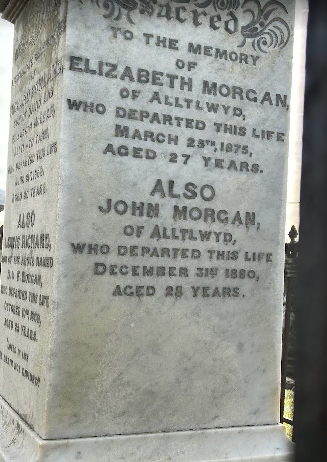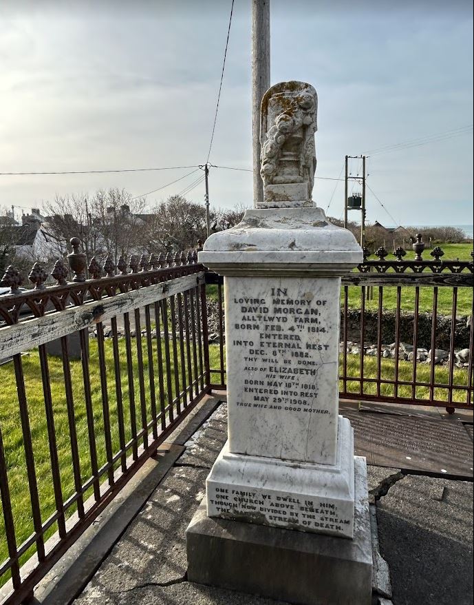 Elizabeth and David had a large family of 10 children. However in 1869 tragedy struck and they lost their two oldest boys Lewis (25) and Richard (20) to tuberculosis in the space of a couple of months. Over the next 15 years they were to lose three more young adults to this terrible illness. David was present at the death of the first four children. They are all buried at St Ffraids.