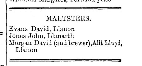 On his wedding record David is recorded as being a maltster and still living at his father’s farm of Pantamanlwg. In fact he had taken on ownership of Felinfor brewery in 1837 from Evan Morris his brother in law (Evan was married to his older sister Mary). He renamed the business Aberclydan Brewery.