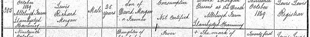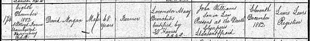 David died at home at Alltlwyd farm aged 68. His brother in law John Williams was present at his death.