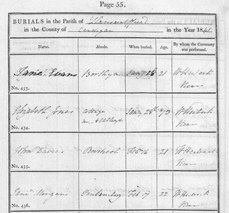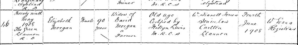 Elizabeth died at “The Green”, Llanon in 1908. Her son in law Captain William Sinnett Jones was present at her death.