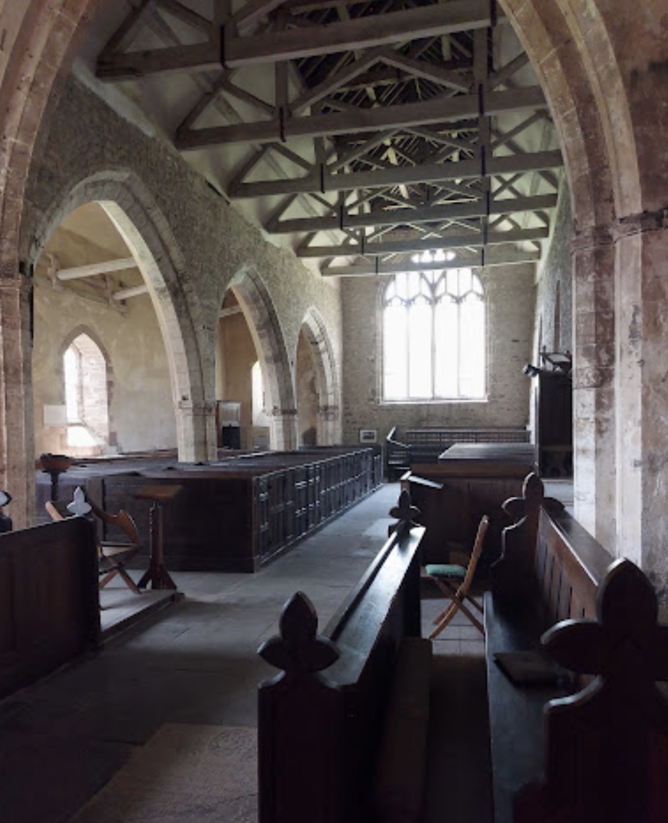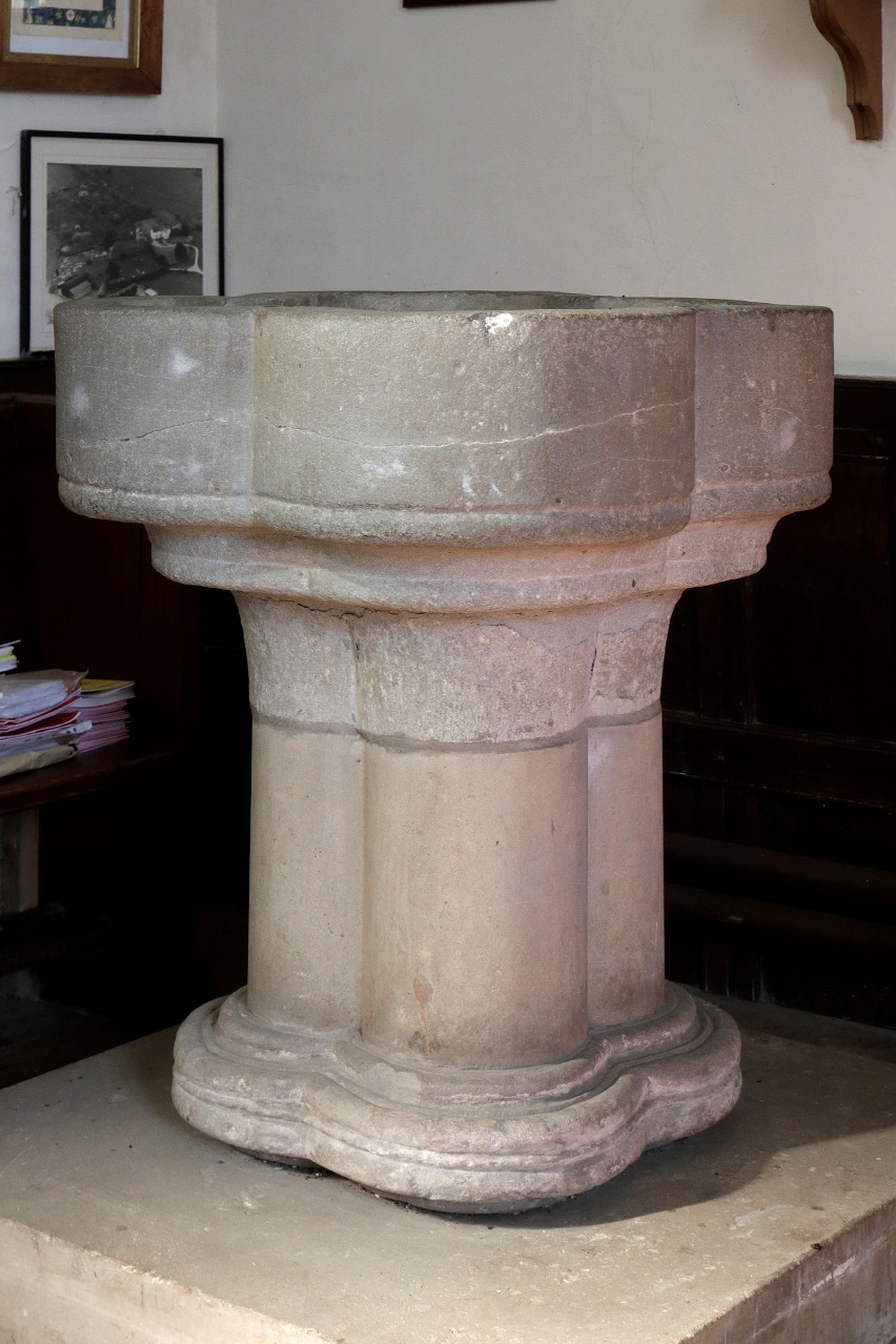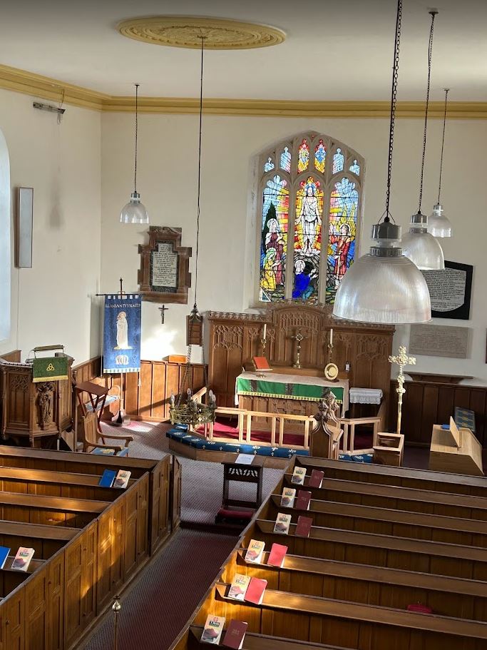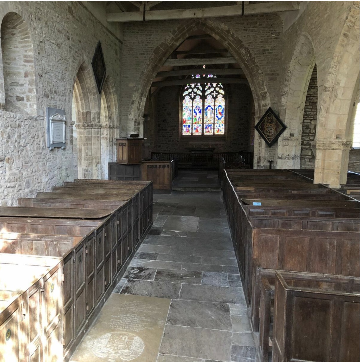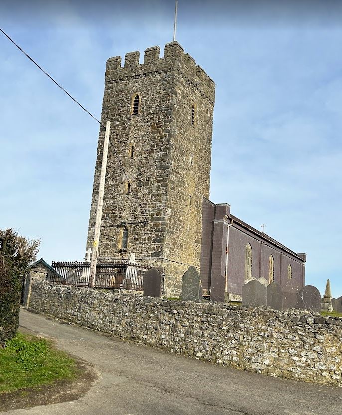 “We know a church has been on this site since the 12th century, as Roger de Clare the church to the Knights Hospitaller of Slebech in 1158, and this granting was confirmed by Rhys ap Gruffydd later in the 12th century. The only survival from this time in the church is the square limestone font with its band of rosette mouldings which dates from the 12th or 13th century. The tall square tower dates from the 16th century and retains its original windows and rare surviving medieval bell frame inside; while the rest of the building was rebuilt in the 19th century.