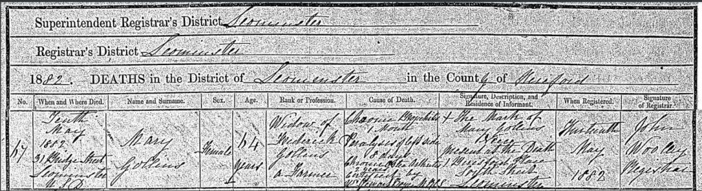 Mary died in 1882. It says on the death certificate that one of her neices Mary Gollins is present at her death. I can’t find an obvious candidate for this Mary in my research. So it looks like I am missing some of her siblings children.