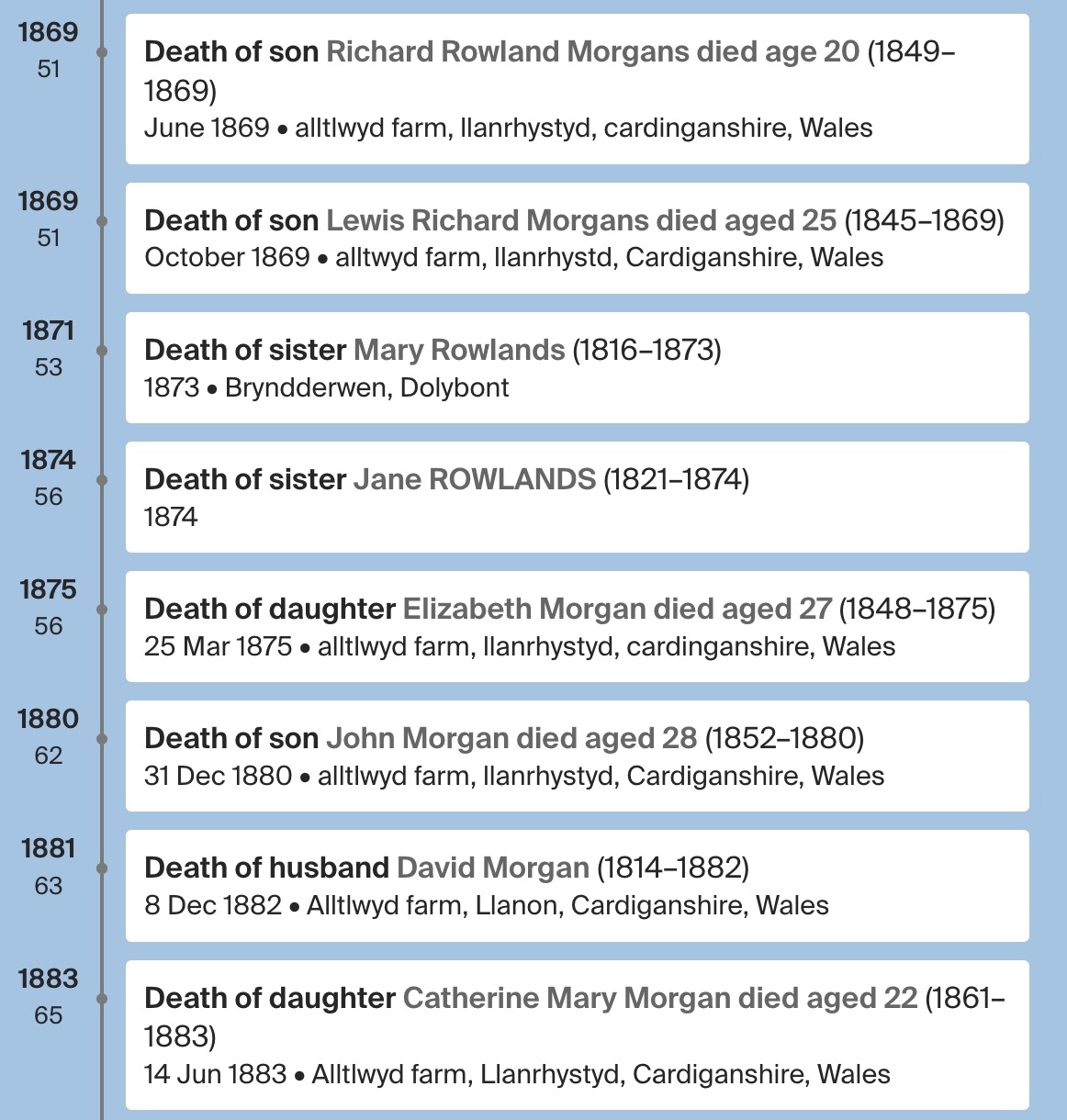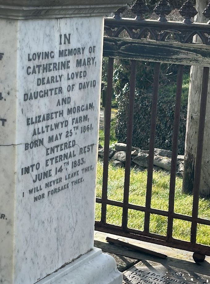 In a final blow Elizabeth’s youngest daughter Catherine died at Alltlwyd farm the following year aged 22.