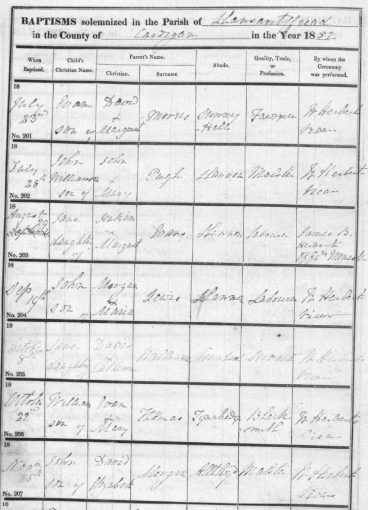 The baptism records and birth records for the couples’ first three children show them living at “Green Castle”. Green Castle Inn was the name of a pub on Bridge street in Llanon. So it seems likely that David was brewing and also running a pub. David carried on Brewing until his death in 1882.