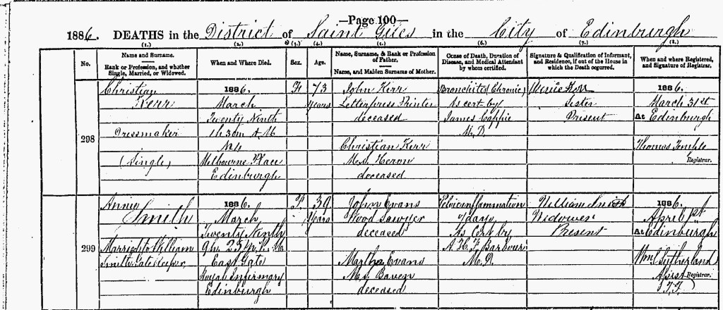 Sadly five years later in 1886 Ann died of pelvic inflammation – possibly this was a post partum infection as she had just given birth to her 10th child Nelly. William was present at her death. She was buried in Morningside Cemetery in Edinburgh.
