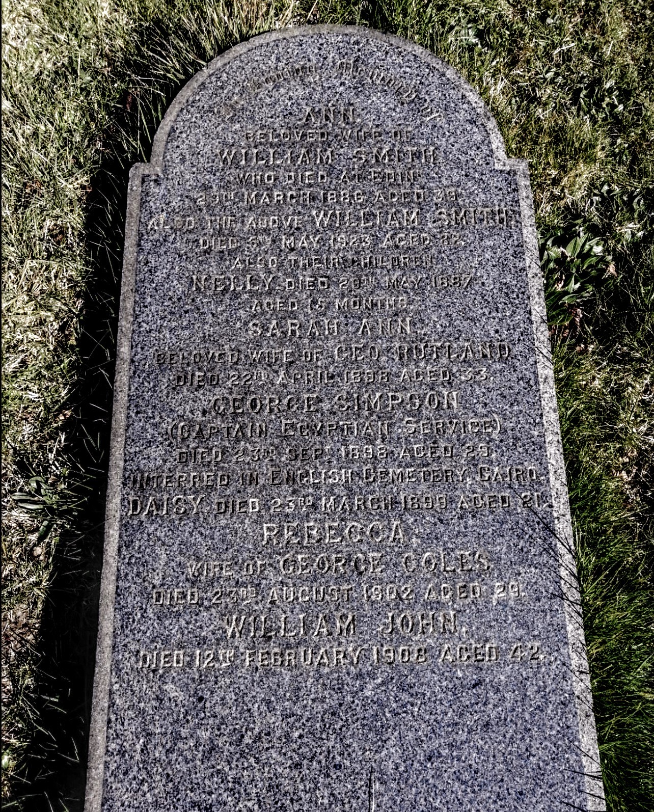Simpson had had a large family with his first wife Hannah and had sadly been widowed. William and his full brother Boyle were the two youngest children. Their mother was Sarah Foster (Fulstone on William’s death certificate) who came from Birmingham. When William was a little older his father bought a large yard a bit further out of town and the family continued to live there. Records say that Simpson’s father was a Robert Smith also a Stone Mason from Glasgow. So perhaps William always had a Scottish identity.