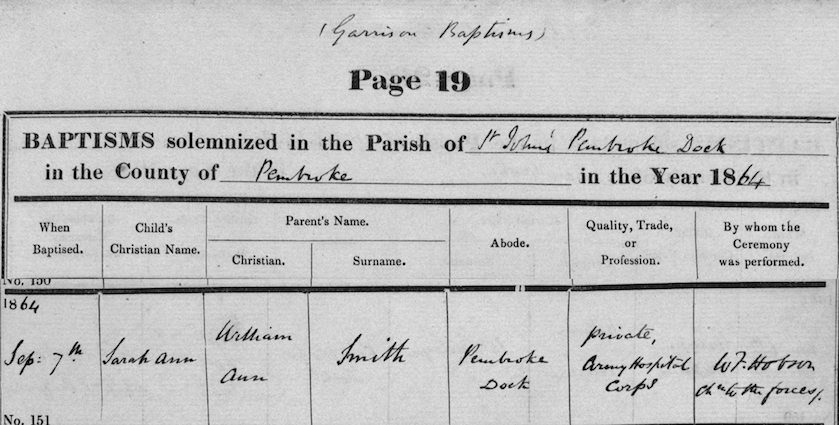 William joined the medical corp of the army when he was 18. He joined up in Liverpool. He spent a year and a half in the East Indies with the medical corp from 1859. He was then stationed for a while near Pembroke Dock. Whilst he was there he met Ann and they married.
