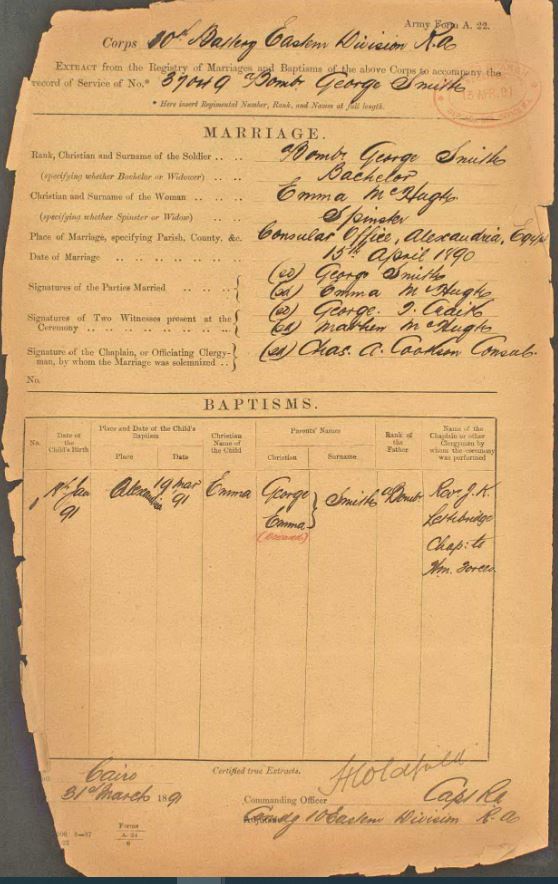 The father Matthew McHugh was a Major in the Army. He married Louisa Emma Sawyer in Kent in 1865,
