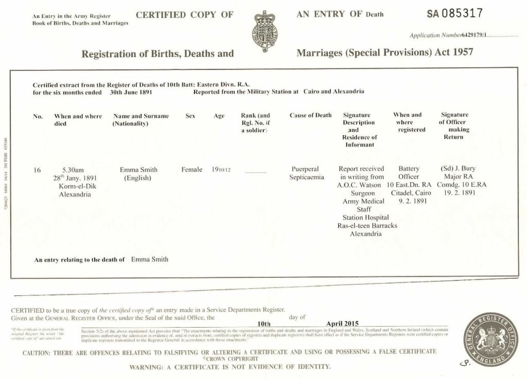 Emily immeadiately became pregnant. She gave birth to Emma Smith in Alexandria on the 18th January 1891. Sadly she died 10 days later as the record below records.